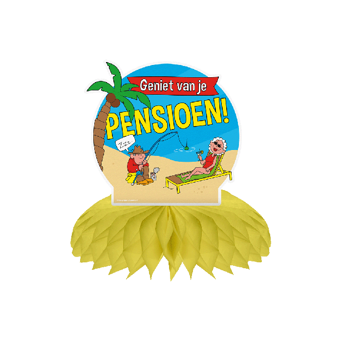 Vier het begin van een welverdiend pensioen met deze vrolijke tafel decoratie! De decoratie toont een ontspannen tafereel met de tekst “Geniet van je pensioen!” en brengt meteen een feestelijke vakantiesfeer op tafel. Dankzij de gele honingraatvoet blijft de decoratie stevig staan en vormt hij een opvallende blikvanger op iedere pensioenviering. Met een afmeting van ongeveer 19 bij 16,5 centimeter is deze tafeldecoratie perfect als middelpunt op de feesttafel of als grappig detail bij de hapjes en drankjes. Een leuke manier om iemand een fijne en ontspannen toekomst te wensen!