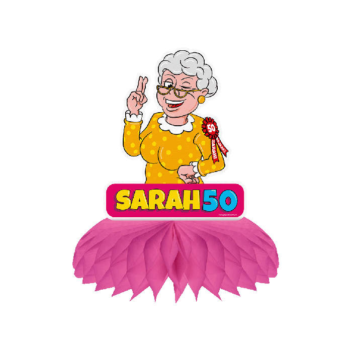 Vier de 50e verjaardag van Sarah in stijl met deze vrolijke tafel decoratie. De stevige kartonnen standaard toont een feestelijke Sarah-figuur met de tekst ‘Sarah 50’ en heeft een roze honingraatvoet die zorgt voor een speelse uitstraling. Met een formaat van ongeveer 20,5 bij 16,5 centimeter is dit de perfecte blikvanger op de feesttafel, bij de taart of op de cadeautafel. De decoratie is gemaakt van papier, eenvoudig op te zetten en herbruikbaar. Een gezellige toevoeging aan elk Sarah-feest!