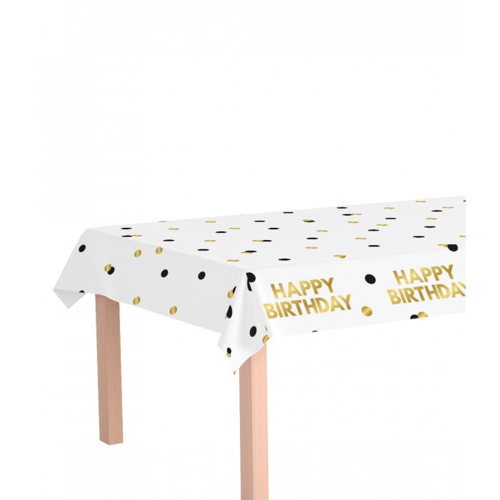 Vier elke verjaardag in stijl met dit feestelijke Happy Birthday tafelkleed. Het witte tafelkleed is versierd met zwarte, gouden en zilveren confetti en de tekst ‘Happy Birthday’ in luxe gouden letters. Met een afmeting van 137 bij 214 centimeter is het perfect om je feesttafel te beschermen én feestelijk aan te kleden. Het tafelkleed is gemaakt van stevig materiaal en zorgt direct voor een stijlvolle uitstraling op elk verjaardagsfeest, of het nu voor jong of oud is. Combineer het met bijpassende borden, bekers en servetten voor een compleet geheel.
