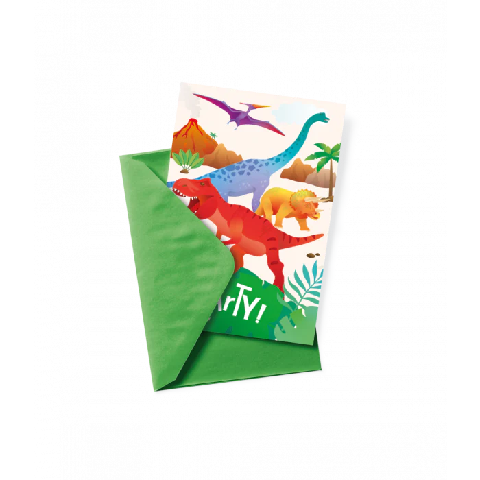 Iemand uitnodigen voor een kinderfeestje kan perfect met de leuke 'dino' uitnodigingskaarten! - Uitnodigingskaarten Dinosaurus 6 Stuks Inclusief Envelop