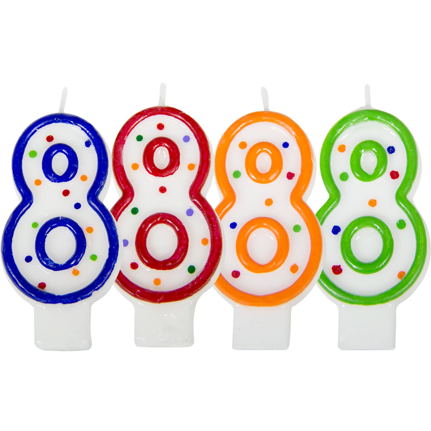 Leuke kaars voor de verjaardagstaart. De verjaardagskaars is versierd met gekleurde stippen en heeft de vorm van het cijfer 8. Deze kaars is ongeveer 7 cm lang.