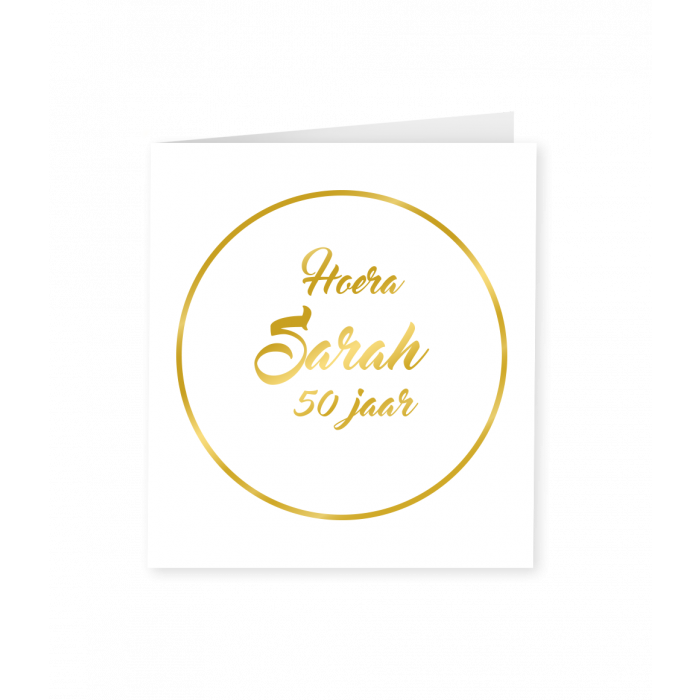 De Verjaardagskaart Goud Wit Sarah 50 Jaar is een feestelijke manier om een vijftigste verjaardag te vieren. Met de sierlijke gouden tekst Hoera Sarah 50 jaar in een elegante omlijsting heeft deze kaart een chique en vrolijke uitstraling.