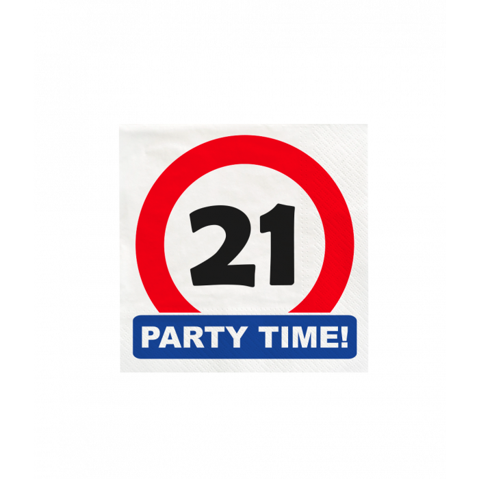 Maak jouw 21e verjaardag compleet met deze feestelijke Party Time servetten in verkeersbord stijl. De set bevat 16 servetten van 33 x 33 cm, bedrukt met het cijfer 21 in een opvallend verkeersbord design. Perfect om de feesttafel aan te kleden en te combineren met andere verkeersbord versiering. Handig, feestelijk en onmisbaar bij taart, hapjes en drankjes tijdens jouw 21 jaar party.