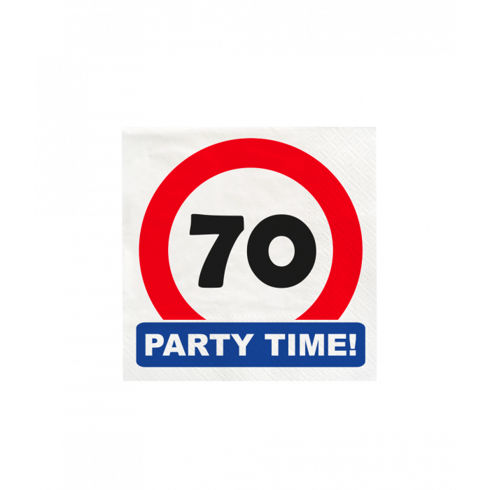 Maak een 70e verjaardag compleet met deze vrolijke Verkeersbord 70 Jaar Party Time Servetten. De servetten zijn bedrukt met het bekende verkeersborddesign met het cijfer 70 en geven de feesttafel direct een speelse en feestelijke uitstraling.