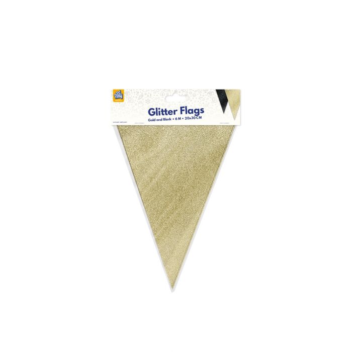 Deze glitter vlaggenlijn in goud en zwart van 6 meter geeft ieder feestje een luxe en stijlvolle uitstraling. De glinsterende gouden vlaggen in combinatie met de chique zwarte vlaggen zorgen voor een feestelijke, maar ook elegante look.