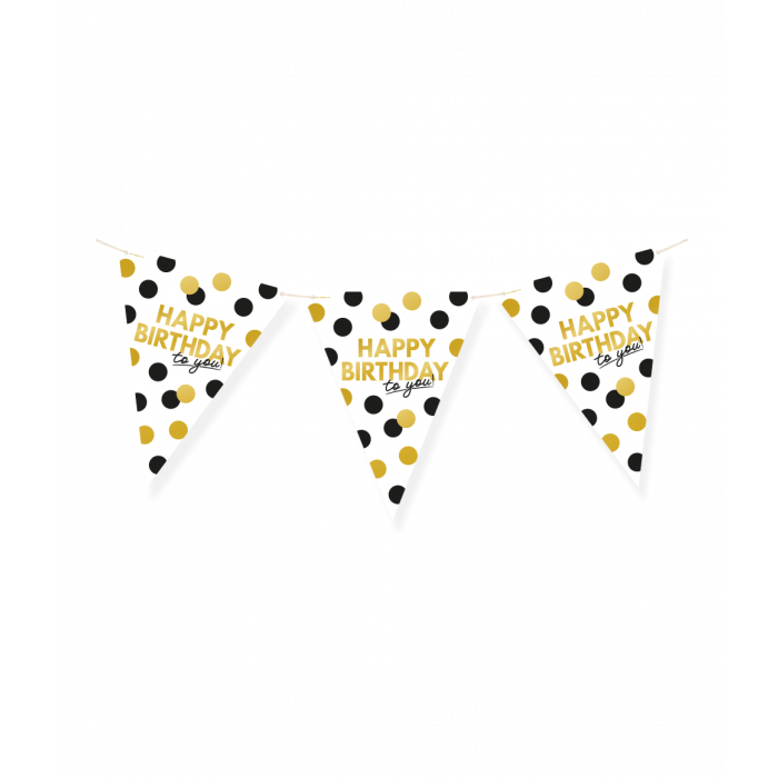Versier je feestje in stijl met deze elegante vlaggenlijn! De wit-zwarte vlaggen met gouden accenten en de tekst “Happy Birthday to you” geven elke verjaardag een feestelijke en chique uitstraling. Perfect te combineren met andere zwart-gouden feestdecoraties.