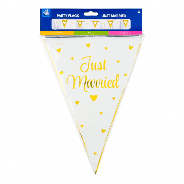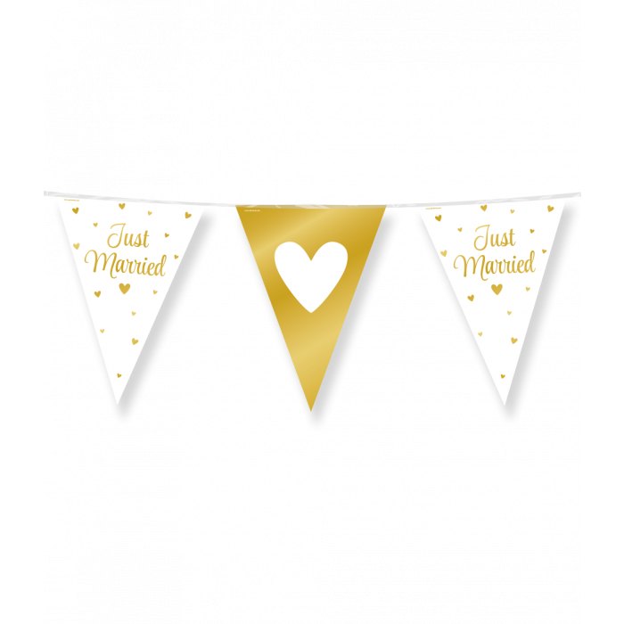 Vier jullie huwelijk met deze prachtige Just Married vlaggenlijn! De witte vlaggen met gouden hartjes en sierlijke letters zorgen voor een romantische en feestelijke uitstraling op jullie speciale dag. Perfect om de feestlocatie, tuin of woonkamer mee te versieren. Dankzij de lengte van 10 meter en het dubbelzijdige ontwerp komt deze vlaggenlijn overal goed tot zijn recht. Gemaakt van stevig folie waardoor hij zowel binnen als buiten te gebruiken is. Ideaal voor bruiloften, recepties of als verrassing voor het pasgetrouwde stel.