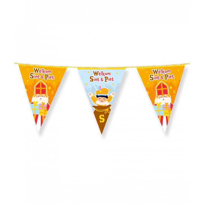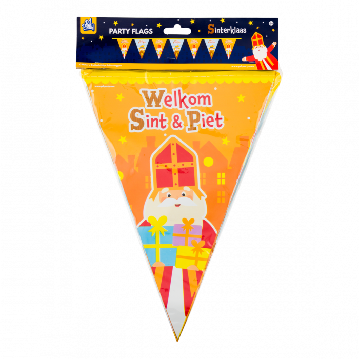 Versier je huis in Sinterklaassfeer met deze vrolijke Sinterklaas vlaggenlijn! De vlaggetjes zijn bedrukt met de tekst "Welkom Sint & Piet" en een kleurrijke afbeelding van Sinterklaas met cadeautjes. Met een lengte van 10 meter is deze slinger ideaal om de woonkamer, klas of winkel feestelijk aan te kleden. Dankzij het dubbelzijdige folie zijn de vlaggetjes van beide kanten goed zichtbaar, perfect voor zowel binnen als buiten. Een onmisbaar feestartikel om kinderen en volwassenen direct in de Sinterklaasstemming te brengen.