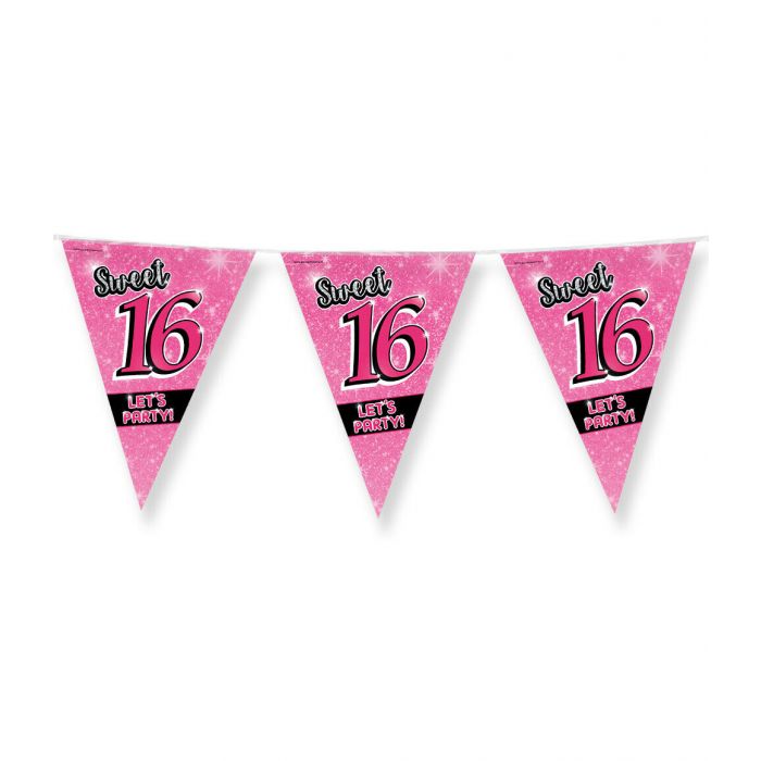 Vier een onvergetelijke Sweet 16 met deze feestelijke vlaggenlijn! De felroze vlaggen met glittereffect en de tekst “Sweet 16 – Let’s Party!” zorgen direct voor een sprankelende sfeer. Met een lengte van 10 meter kun je eenvoudig een kamer, tuin of feestzaal omtoveren tot een echte partyzone. De vlaggenlijn is gemaakt van stevig folie en is dubbelzijdig bedrukt, waardoor hij zowel binnen als buiten prachtig tot zijn recht komt. Ideaal voor een verjaardag die groots gevierd mag worden!