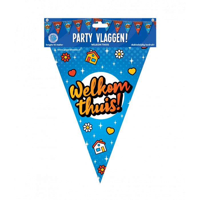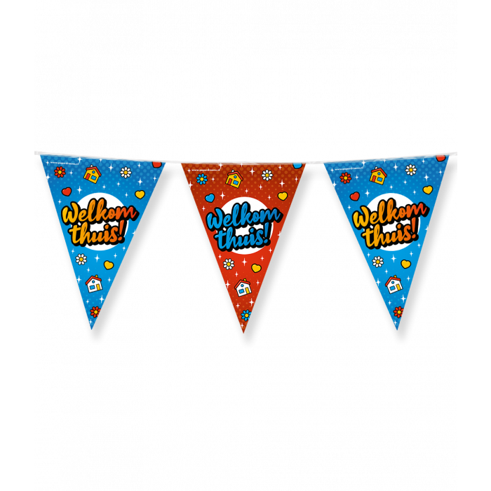 Maak een thuiskomst extra feestelijk met deze kleurrijke Welkom Thuis vlaggenlijn! De vrolijke vlaggetjes met huisjes, bloemen en hartjes brengen direct een warme en feestelijke sfeer in huis. Met een lengte van 10 meter is de slinger ideaal om een woonkamer, tuin of entree mee te versieren. De vlaggen zijn gemaakt van stevig folie en dubbelzijdig bedrukt, zodat ze van alle kanten goed zichtbaar zijn. Perfect om iemand op een speciale manier welkom te heten.