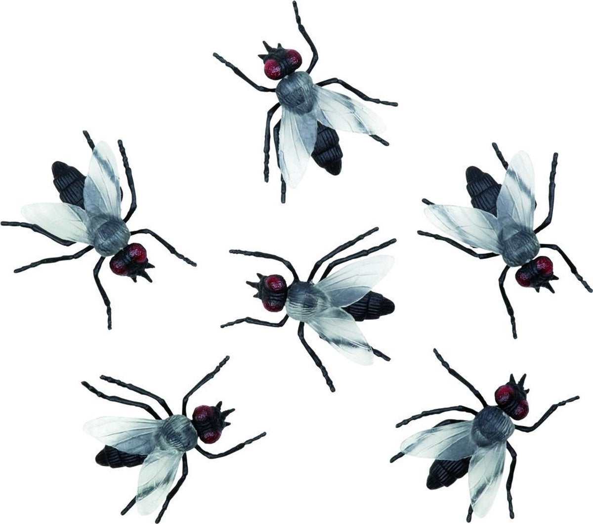 Zwarte Vliegen Halloween decoratie - Deze set Halloween versiering bestaat uit 6 zwarte, plastic vliegen. Deze meten 4 cm lang. Ideaal voor de Halloween feesttafel mee te versieren."