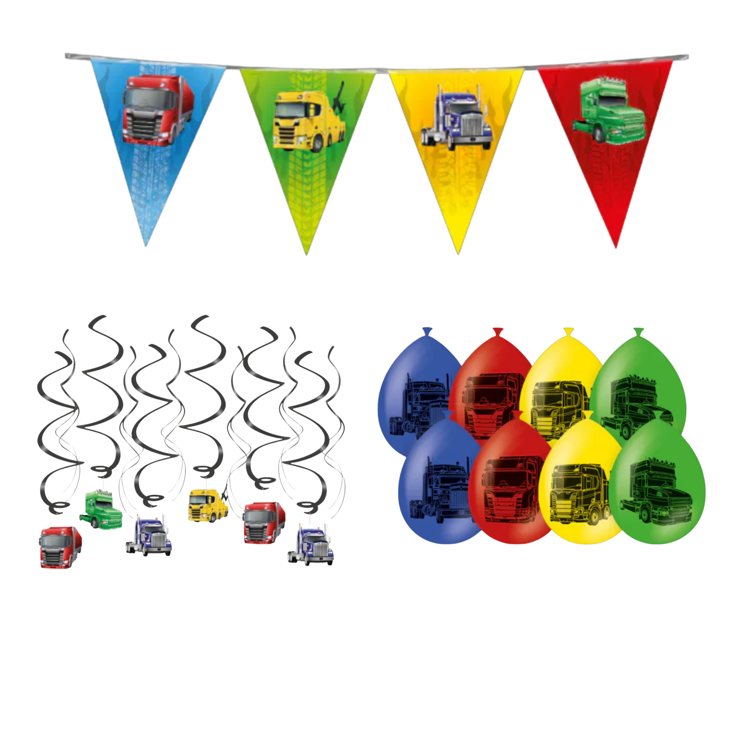 Het pakket bevat een lange vlaggenlijn van 10 meter met verschillende vrachtwagens die je eenvoudig langs een muur, deur of in de tuin kunt ophangen. De ballonnenset bestaat uit acht ballonnen met duidelijke truckprints in verschillende kleuren en brengt direct volume en kleur in de feestruimte. Daarnaast bevat dit pakket twaalf swirls die aan het plafond of deurposten gehangen kunnen worden. Aan de swirls hangen stoere trucks, waardoor ze speels meebewegen en het thema overal terugkomt.