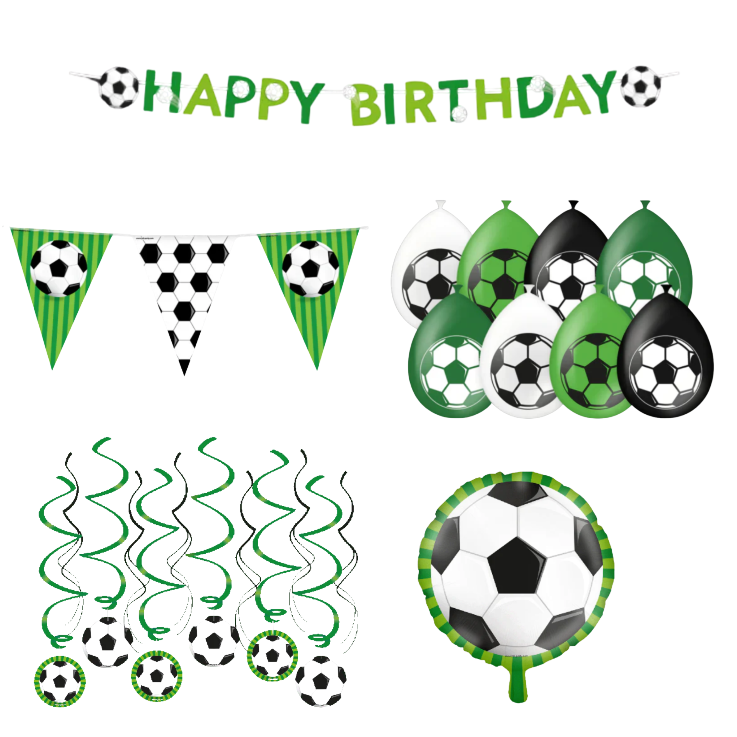 Het pakket bevat een “Happy Birthday” letterslinger die meteen de juiste feestsfeer neerzet. De vlaggenlijn met voetbalvlaggetjes is perfect om muren, ramen of de tuin te versieren en zorgt direct voor een sportieve uitstraling. De set bevat daarnaast acht ballonnen met voetbalopdruk in groen, wit en zwart, die het thema helemaal compleet maken. De grote folieballon in voetbalvorm is een echte eyecatcher en leuk om bij de cadeautafel of stoel van de jarige op te hangen.