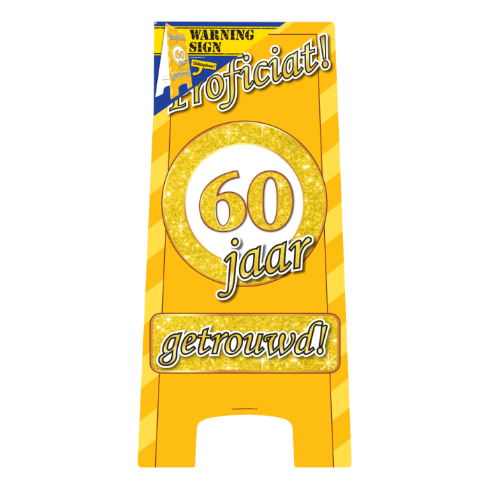 Vier een onvergetelijke mijlpaal met dit feestelijke Warning Sign 60 Jaar Getrouwd. In een gouden en sprankelende uitvoering met de tekst "Proficiat! 60 jaar getrouwd!", is dit bord een prachtige eyecatcher voor elk diamanten huwelijksfeest. Zet het bij de ingang, in de tuin of op de feestlocatie en laat iedereen zien dat er iets bijzonders te vieren is. Gemaakt van licht papier en plastic, waardoor het bord eenvoudig neer te zetten en te verplaatsen is. Perfect om dit unieke jubileum extra glans te geven.