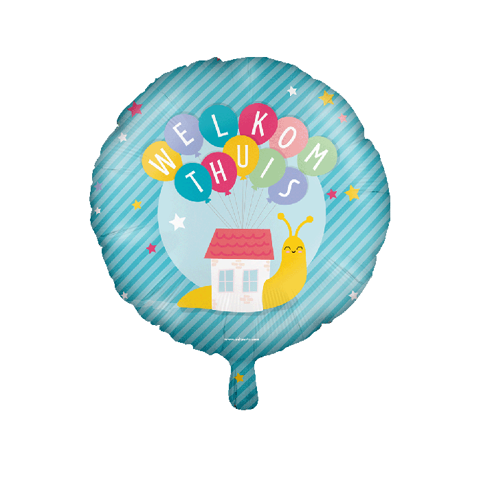 Verras iemand met een warm welkom met deze vrolijke ronde folieballon met de tekst Welkom Thuis. Het speelse ontwerp met ballonnen, een huisje en een glimlachende slak maakt deze ballon perfect voor een thuiskomst, na een reis of ziekenhuisopname, of als felicitatie bij een nieuwe woning.