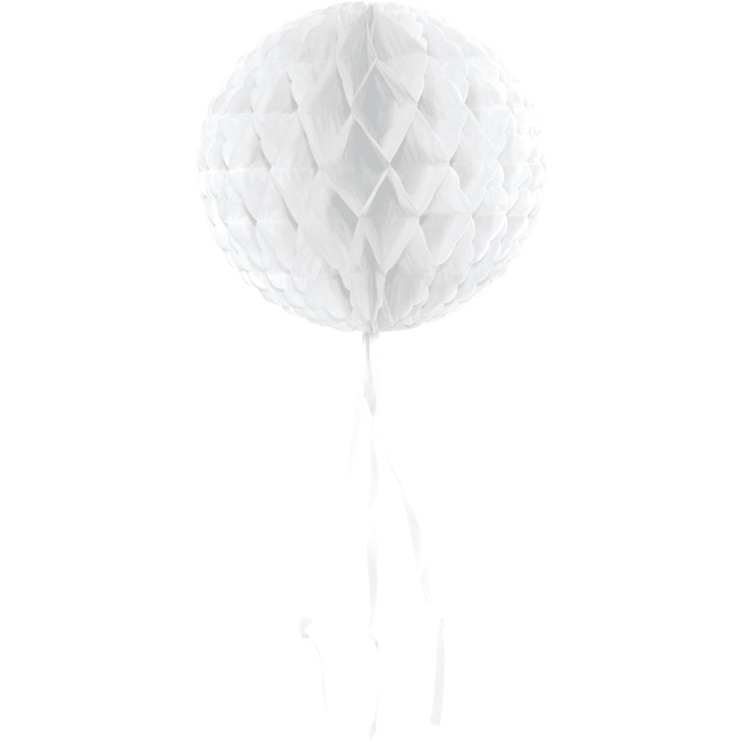 Ronde wtte honeycomb bol van 30 cm. Deze klassieke versiering is ook zeer geschikt voor bruiloften. Deze bolvormige honeycomb is een subtiele decoratie. Combineer verschillende versieringen voor een feestelijke sfeer.